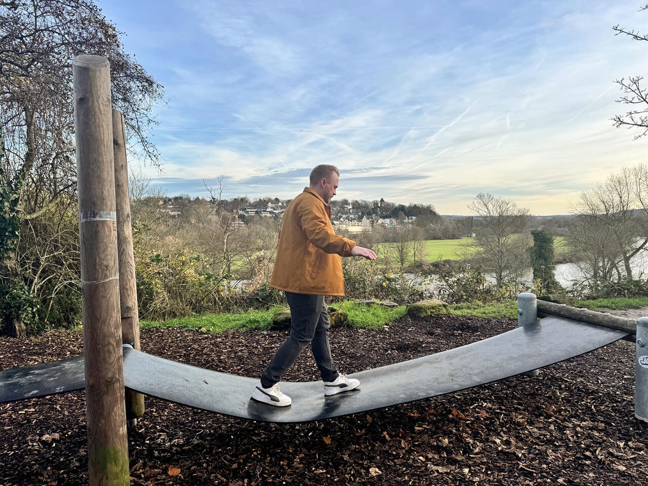 Nachdem wir die riesigen Wurzeln bestaunt haben, toben wir uns auf der anderen Seite des Weges noch ganz erwachsen ein bisschen an den Spielgeräten aus, die hier unter anderem zum Hüpfen und Balancieren stehen.