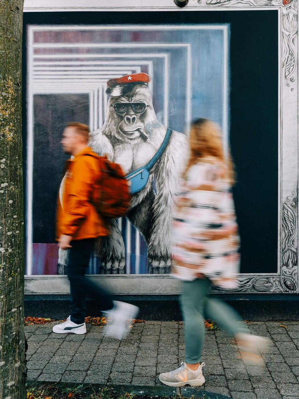 Als nächstes wollen wir zum Radschnellweg Ruhr. Auf dem Weg dorthin kommen wir am Gleis 76, unserer zweiten Station, vorbei. Das ist kein mysteriöses Gleis des Bahnhofs, sondern ein Club in der Nähe. Die Außenwand ist markant: Ein riesiger Affe blickt mich an, Urban Street Art at its best.